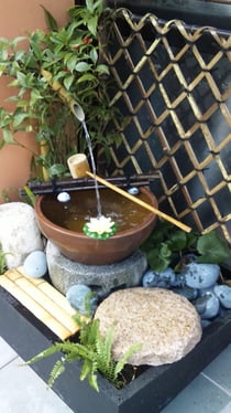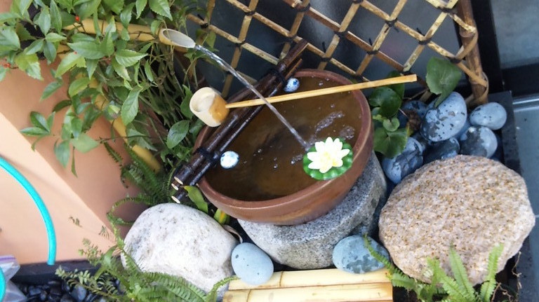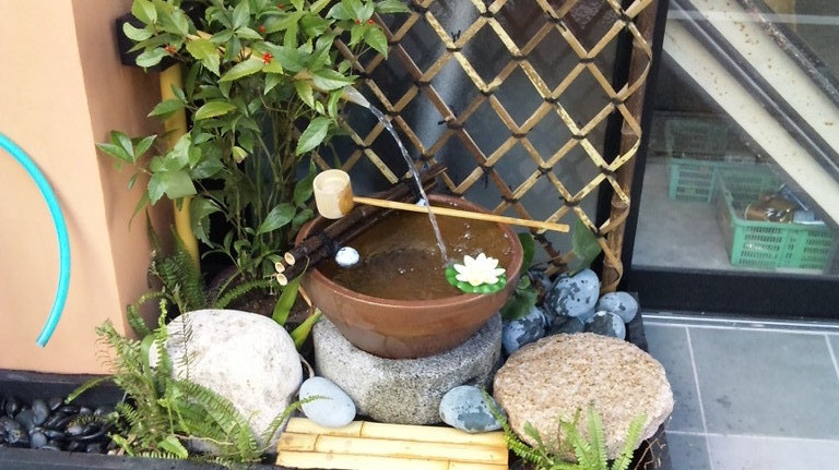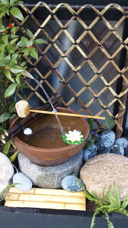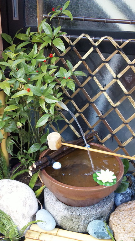 かけひに水鉢、ひしゃく、竹垣